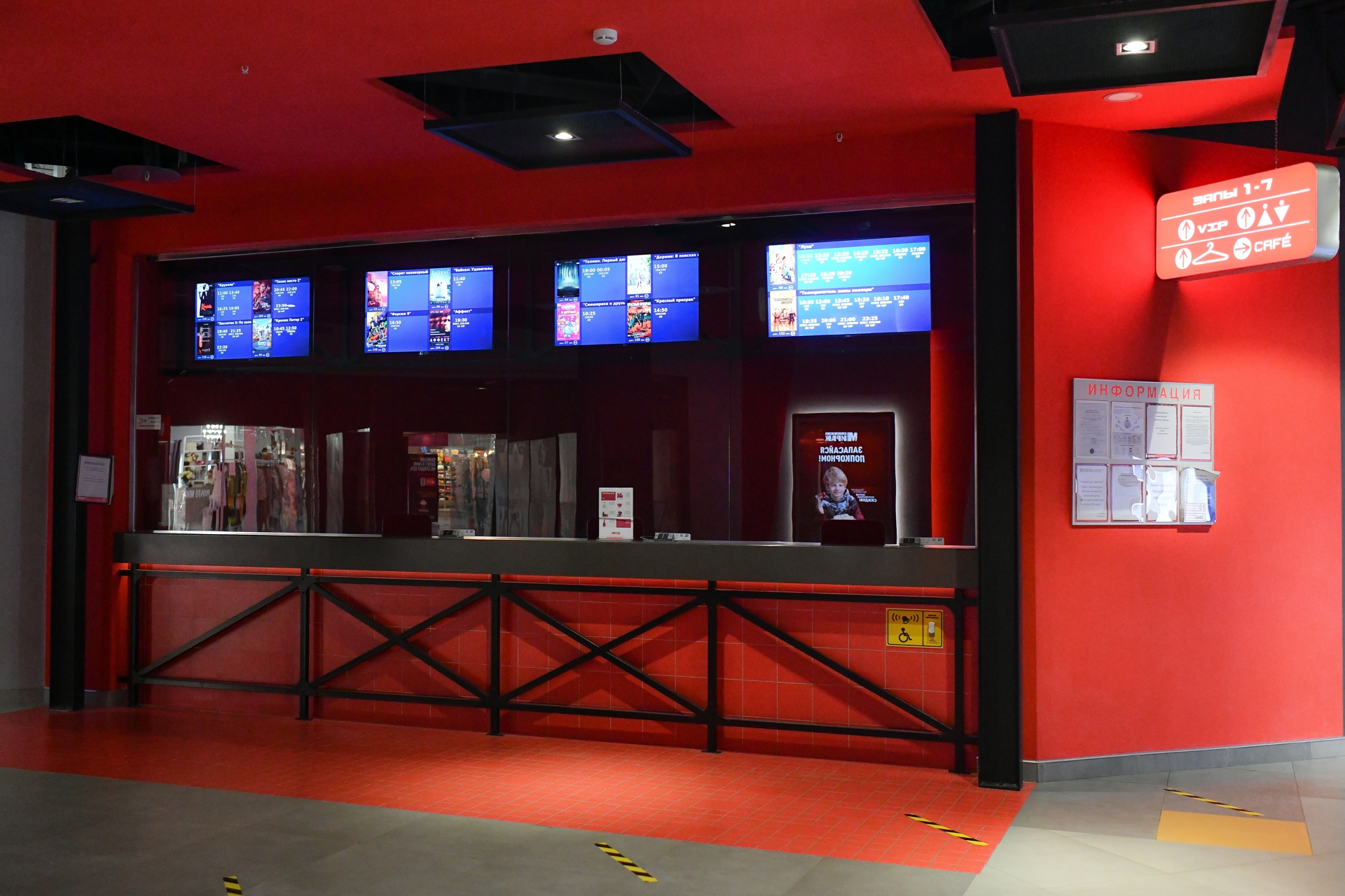 Для вашего удобства в трёх залах ожидания кинотеатра расположены диваны и столики. Плазменные экраны транслируют актуальную информацию, а бесплатный WI-FI позволяет быстро связаться с близкими, чтобы пригласить их в кино или на кофе. Также обращаем внимание, что у VIP залов имеется отдельная зона ожидания.