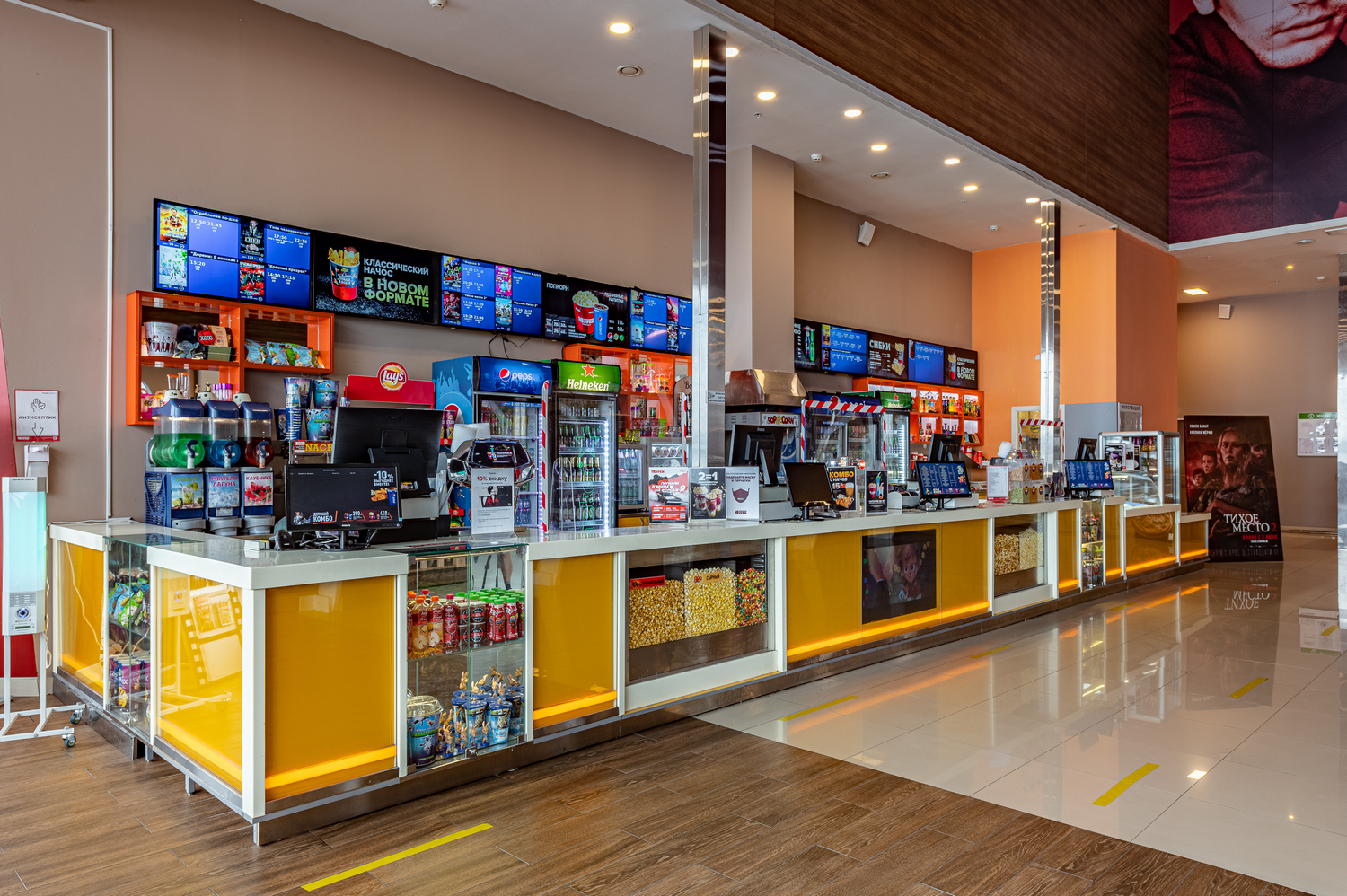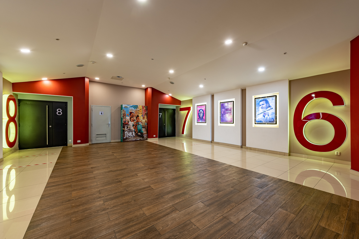 Открытый атриум с высокими колоннами, просторные площади кинотеатра, просматриваемые от входа до последнего зала, делают весь интерьер воздушным, будто парящим. Насыщенные цвета в терракотовой гамме и комфортные кожаные диваны создают уют.